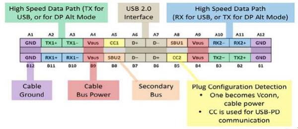 圖1:USB Type-C的接口功能定義,從結(jié)構(gòu)上實(shí)現(xiàn)了無方向正反插