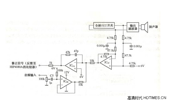 D類功放將音頻信號轉變?yōu)閷挾入S信號幅度變化的高頻脈沖,控制功率管以相應的頻率飽和導通或截止,功率管輸出的信號經(jīng)低通濾波器驅(qū)動揚聲器發(fā)聲。因功率管大部分時間處于飽和導通和截止狀態(tài),功率損耗很小,其效率可達90%以上。典型的D類功放可提供200W輸出,效率達94%,諧波失真在1%~2.8%。