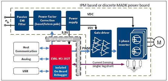 The EVAL-M3-102T evaluation board is a part of the iMOTION™ Modular Application Design Kit for drives(iMOTION™ MADK). In order to run a motor, the mating power board is required to interface this evaluationboard.