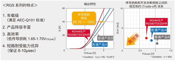 尤其是在電動壓縮機和PTC加熱器中,由于驅動頻率較低,故對傳導損耗的重視程度高于開關特性,RGS系列的出色表現(xiàn)已經獲得客戶的高度好評。