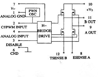 SA60 的內(nèi)部結(jié)構(gòu)框如圖2 所示。電路共有12個(gè)引腳,其中10、7 兩腳分別是H 橋和PWM 及橋的驅(qū)動(dòng)級(jí)電源端; 9、11 為功率信號(hào)輸出端, 其輸出波形與輸入信號(hào)的關(guān)系是:9 腳輸出PWM 信號(hào)的占空比隨輸入信號(hào)電壓的增加而增大,11 腳卻反之; 1、6腳為接地端, 前者是模擬接地端, 后者是功率接地端;8、12 端可以直接接功率地, 也可以通過(guò)一個(gè)電阻接地,作為限流感用,該端的電壓最大值為±2V ;2、4 兩端分別是模擬和數(shù)字控制信號(hào)的輸入端。