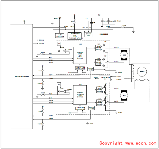 The MAX22203 can be used to drive two Brushed DC motorsor a single Stepper Motor.