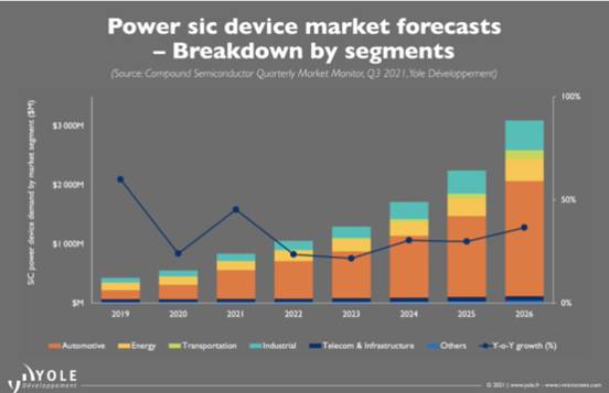 在過去的幾十年中,SiC(碳化硅)和GaN(氮化鎵)技術(shù)都呈現(xiàn)快速發(fā)展,并且正在被各行業(yè)所接受,有著廣闊的市場前景。第一個商用 SiC 器件是德國英飛凌公司2001年推出的肖特基二極管。預(yù)計到2026 年,工業(yè)市場相關(guān)需求有望超過 40 億美元。