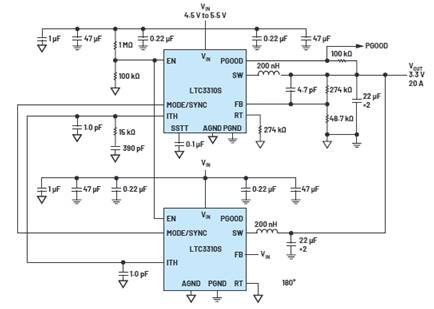 某些單片穩(wěn)壓器可通過多相并聯(lián)操作擴(kuò)展到更高負(fù)載應(yīng)用。圖12顯示了多個LTC3310S器件并聯(lián)并錯相工作,使得電流能力加倍。