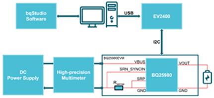 進(jìn)一步地,可以基于BQ25980的EVM板對(duì)該電流檢測方法進(jìn)行驗(yàn)證實(shí)驗(yàn)。具體的測試方案如圖3所示。