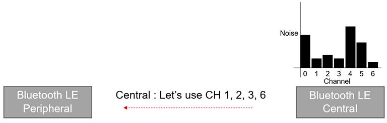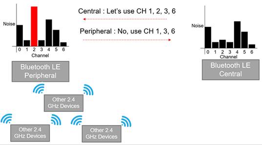 由于中央設(shè)備決定了優(yōu)先級(jí),因此外圍設(shè)備對(duì)使用哪些通道沒(méi)有發(fā)言權(quán)。由于藍(lán)牙設(shè)備可以在越來(lái)越遠(yuǎn)的距離上進(jìn)行通信,外圍設(shè)備和中央設(shè)備的信道條件可能會(huì)有所不同。如果信道圖包含的信道似乎對(duì)中心位置沒(méi)有明顯干擾,但對(duì)外圍位置有明顯干擾,則這種差異會(huì)成為問(wèn)題,如圖 5 所示。
