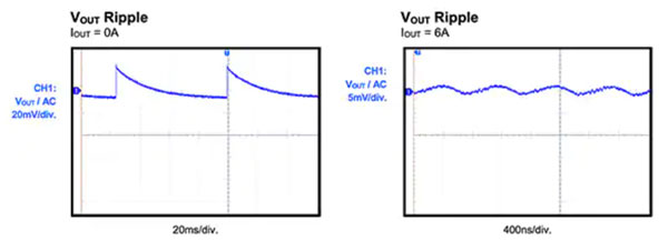 模塊化方法還有一個優(yōu)點:能很好地控制紋波噪音,空載時約 20 mV 和滿載 6 A 時約 5 mV (圖 11)。這意味著在許多情況下無需添加外部濾波器,從而簡化了設計,減少了占地面積并減小了材料清單 (BOM)。