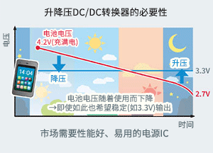 而要降低電源的功耗,就需要在任何負(fù)載條件和工作模式下都能抑制自身功耗并提高效率。電池輸入時(shí),輸入電壓從比設(shè)定的輸出電壓高的初始電壓變?yōu)楸仍O(shè)定的輸出電壓低的電壓。因此,使用升降壓型轉(zhuǎn)換器是非常有助于最大限度地使用電池能量的,可以在輸入(電池)電壓比設(shè)定的輸出電壓高的狀態(tài)下,進(jìn)行高效率的降壓工作,當(dāng)輸入低于設(shè)定的輸出電壓時(shí),切換為高效率的升壓工作,使輸出電壓保持在一定電壓。換句話(huà)說(shuō),無(wú)論輕負(fù)載還是重負(fù)載都高效率、無(wú)論降壓還是升壓都可高效率工作的升降壓轉(zhuǎn)換器可以說(shuō)是能夠使電池壽命最大化的電源。