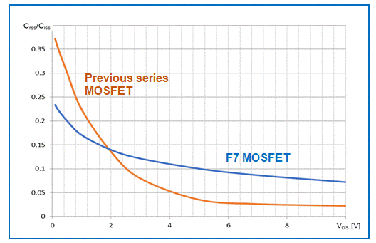 與上一代產(chǎn)品相比,STPOWER STripFET F7系列車規(guī)80V - 100V MOSFET改進(jìn)了米勒效應(yīng)敏感度和電容比(Crss / Ciss)軟度,如圖2所示。