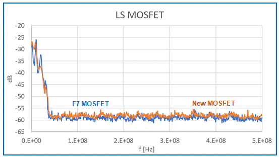 圖7.下橋臂 F7和新MOSFET原型的測(cè)量噪聲輻射頻譜比較