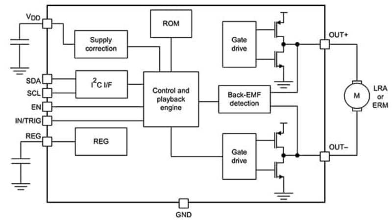圖 4:DRV2605L IC 可以驅(qū)動 LRA 或 ERM 觸感器件。(圖片來源:Texas Instruments)