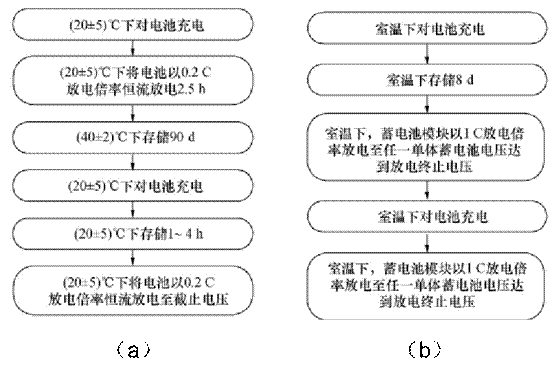 在國(guó)際標(biāo)準(zhǔn)化機(jī)構(gòu)及各國(guó)政府相關(guān)部門和行業(yè)協(xié)會(huì)發(fā)布的電池測(cè)試手冊(cè)中,對(duì)通過容量測(cè)量來檢測(cè)電池自放電作了相關(guān)規(guī)定:國(guó)際電工委員會(huì)(IEC)發(fā)布的《含堿性或其他非酸性電解質(zhì)的蓄電池和蓄電池組:便攜式二次鋰電池和蓄電池組》(IEC 61960)中規(guī)定,將處于50%SOC狀態(tài)下的電池,在環(huán)境溫度(20±5)℃下存儲(chǔ)90d,再次充電后電池的放電量應(yīng)不小于額定容量的85%,具體測(cè)量流程如圖2a所 示。美國(guó)汽車研究委員會(huì)(USCAR)發(fā)布的電動(dòng)車用電池測(cè)試手冊(cè)規(guī)定,測(cè)量前應(yīng)先測(cè)量與電池工作區(qū)間對(duì)應(yīng)的實(shí)際電量。將電池以C/3倍率放出50%的可用電量后,在環(huán)境溫度30℃下存儲(chǔ)30d,再次充電后測(cè)量電池的放電量。中國(guó)國(guó)家標(biāo)準(zhǔn)化管理委員會(huì)發(fā)布的《電動(dòng)汽車用動(dòng)力蓄電池性能要求及試驗(yàn)方法》(GB/T 31486)與IEC標(biāo)準(zhǔn)較為相近,規(guī)定了荷電保持及容量恢復(fù)能力的測(cè)量試驗(yàn)流程。以室溫試驗(yàn)為例,電池在室溫條件下存儲(chǔ)8d,要求荷電保持率不低于初始容量的85%,容量恢復(fù)不低于初始容量的90%。具體測(cè)量流程如圖2b所示。