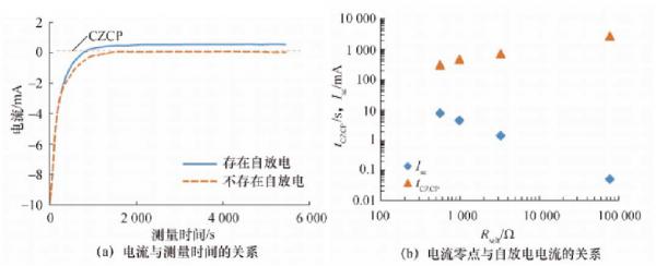 Sazhin等對(duì)上述常規(guī)的靜置測(cè)量電流方法作了一定的改進(jìn),使用電化學(xué)工作站對(duì)電池施加一個(gè)比開路電壓低的恒定電壓,同時(shí)測(cè)量電路中流過的電流,不存在自放電和存在自放電的電池的電流-時(shí)間曲線如圖3a所示。