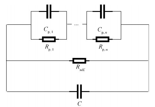 李革臣等[4-5]利用自動(dòng)化系統(tǒng)辨識(shí)理論,將鋰離子電池簡(jiǎn)化為一階電阻-電容(R-C)等效電路,對(duì)鋰離子電池和等效電路施加相同的充放電電流,根據(jù)輸出電壓的差異調(diào)整等效電路的參數(shù),直到二者差異趨近于零,就得到了鋰離子電池自放電電阻值。這種方法需要的總測(cè)量時(shí)間約為12h。但是,該方法將電池等效為一個(gè)無源電路,未考慮在實(shí)驗(yàn)過程中電池荷電狀態(tài)變化對(duì)輸出電壓產(chǎn)生的影響。Schmidt等[6]將電池簡(jiǎn)化為如圖4所示的等效電路。其中:Rp,i為電化學(xué)反應(yīng)電阻,Cp,i為雙電層電容,Rself為自放電電阻,C為電池等效電容。通過對(duì)鋰離子電池施加短時(shí)間的電流脈沖,測(cè)量隨后靜置過程中的電壓變化,進(jìn)一步解析得到自放電電阻值。該方法僅考慮靜置時(shí)每一階段起主導(dǎo)作用的反應(yīng),將復(fù)雜的反應(yīng)機(jī)理解耦,在減少計(jì)算量的同時(shí)也縮短了測(cè)量時(shí)間。