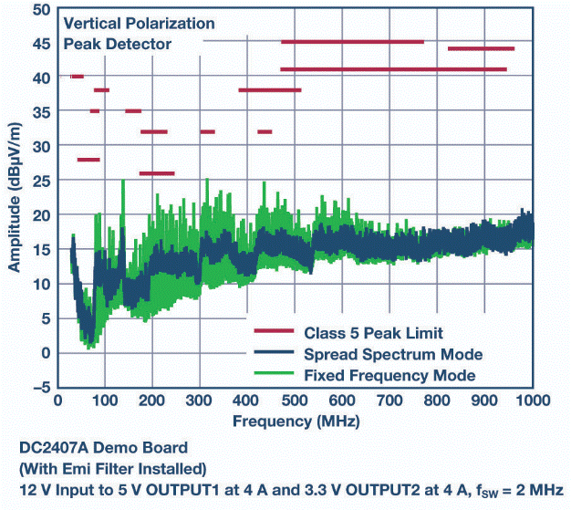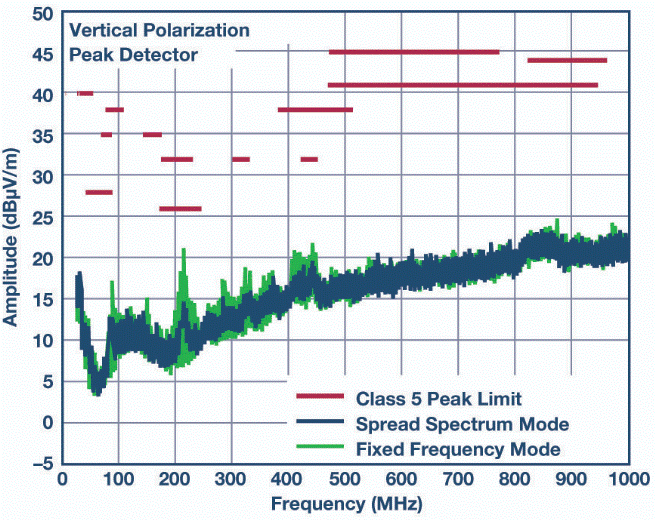 有關(guān)排放輸出特性,請(qǐng)參見(jiàn)圖4。這種改進(jìn)的EMI/EMC性能對(duì)電路板布局不敏感,即使在使用2層PC板時(shí)也能簡(jiǎn)化設(shè)計(jì)并降低風(fēng)險(xiǎn)。LT8645S可在整個(gè)負(fù)載范圍內(nèi)輕松通過(guò)汽車CISPR 25,5類峰值EMI限制。擴(kuò)頻頻率調(diào)制也可用于進(jìn)一步降低EMI水平。