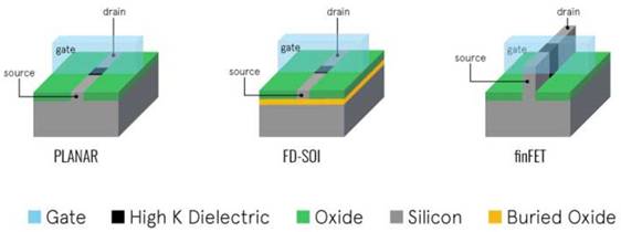 目前正在生產(chǎn)的三種半導(dǎo)體工藝技術(shù),包括用于平面體CMOS硅、用于低噪聲和快速操作的全空乏絕緣上覆硅(FD-SOI) 以及用于高性能的鰭式場效晶體管(FinFET)
