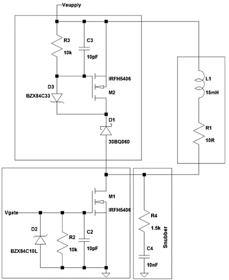 電阻器 R2 和 R3 用于為晶體管的柵極放電,以在電源出現(xiàn)故障時(shí)將其關(guān)閉。齊納二極管 D2 限制 M1 的柵極電壓。C2 和 C3 用于降低dV DS /dt,以避免閂鎖。M1 的柵極連接到控制信號(hào)以關(guān)閉或打開(kāi)負(fù)載。只要負(fù)載電壓約為 50V,鉗位晶體管 M2 就會(huì)導(dǎo)通。二極管 D1 用于阻止 M2 的體二極管導(dǎo)通。二極管 D3 增加鉗位電壓,從而實(shí)現(xiàn)快速關(guān)斷。關(guān)閉時(shí)間由以下等式給出: