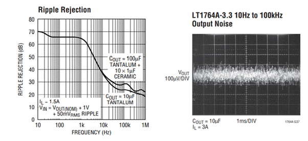 PSRR衡量電路抑制電源輸入端出現(xiàn)的外來(lái)信號(hào)(噪聲和紋波),使這些干擾信號(hào)不至于破壞電路輸出的能力。在實(shí)際場(chǎng)景中越是低頻的噪聲越難抑制。在100 kHz 至 1 MHz 范圍內(nèi)的電源抑制非常重要,因?yàn)?LDO 經(jīng)常跟高效的開關(guān)電源配合使用來(lái)為敏感的模擬電路供電。