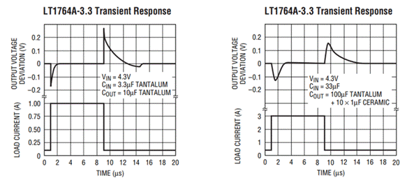 瞬態(tài)響應(yīng)是指電流階躍變化時(shí)的輸出電壓變化。它與電容,控制環(huán)路的增益帶寬和負(fù)載電流變化的大小和速率有關(guān)。
