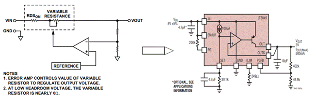 在芯片系列中有線性穩(wěn)壓器(LDO)和開關(guān)電源(DC/DC)。LDO看似簡(jiǎn)單,實(shí)際非常重要。例如,將負(fù)載與不干凈的電源隔離或者構(gòu)建低噪聲電源來(lái)為敏感電路供電。LDO電路簡(jiǎn)單,只能做降壓,低紋波噪聲,快速瞬態(tài)響應(yīng)。