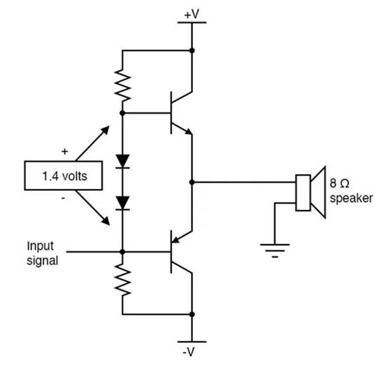 同時使用正電壓和負(fù)電壓電源的 B 類音頻放大器示意圖。