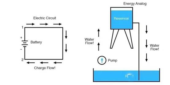 為了幫助理解電壓,圖2 顯示了電路和電荷流的示例圖,以及一個有用的類比。