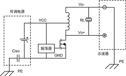 究其原因,如圖1所示,可調(diào)電源對保護(hù)接地線PE實(shí)際上存在電容,以下稱為Ciso,而示波器探頭負(fù)端是接PE的,在高頻下,探頭負(fù)端→PE→Ciso→GND形成一條低阻抗通路。電路的Vo+和Vo-對GND都存在100kHz的電壓,無論探頭負(fù)端接Vo+或Vo-,都產(chǎn)生額外的電流通過探頭負(fù)端→PE→Ciso→GND,在電感的電阻和回路電阻上產(chǎn)生熱量,使電源電流增大,另外并聯(lián)的低阻抗通道改變了驅(qū)動(dòng)器的諧振狀態(tài)。所以并非是示波器的問題,而是不正確的測量方法導(dǎo)致。