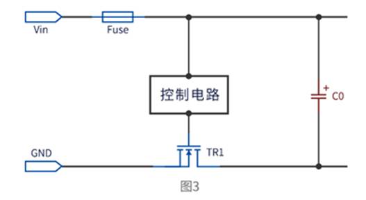 該方案是在輸入回路串入MOS管(需外加控制電路),利用MOS的可變電阻區(qū)進(jìn)行電流抑制,適用小功率輸入沖擊電流抑制。
