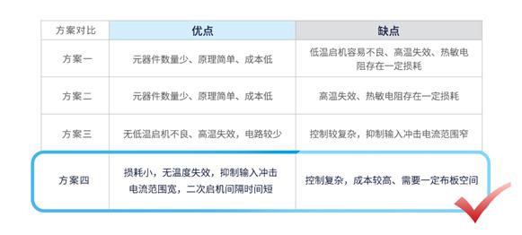 從以上四種常用電路方案的原理以及優(yōu)缺點(diǎn)分析來(lái)看,方案一以及方案二元器件數(shù)量少、原理簡(jiǎn)單、成本低,對(duì)溫度以及損耗要求不高的工況下可使用;方案三適用范圍較窄,可使用在對(duì)溫度要求高的小功率產(chǎn)品上;方案四成本較高,控制復(fù)雜,需要一定布板空間,但優(yōu)勢(shì)也很明顯,具有損耗小,無(wú)溫度失效,二次啟機(jī)間隔時(shí)間短以及抑制輸入沖擊電流范圍寬可調(diào)等優(yōu)勢(shì)。
