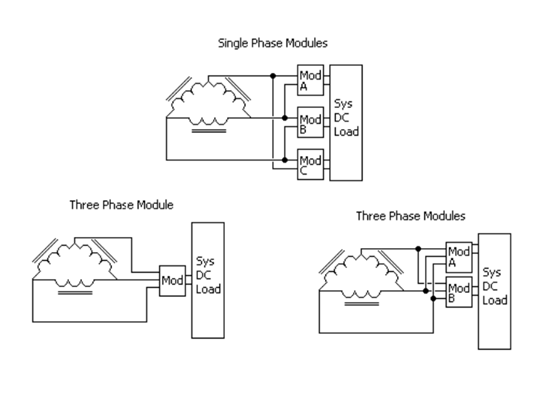 單相模塊具有更簡單、更高效的電源轉(zhuǎn)換電路的優(yōu)點,但為了完全平衡線路電流,電源轉(zhuǎn)換器必須以三的倍數(shù)來實現(xiàn)。在各個電源模塊尺寸和整體系統(tǒng)負(fù)載之間找到合適的配合有時可能具有挑戰(zhàn)性。如果模塊為公共負(fù)載供電,則必須在模塊之間采用功率共享電路,以確保從每相汲取的功率相等。功率共享電路可以采用“下垂”共享電路的形式,其中小的非耗散合成阻抗與每個模塊的輸出串聯(lián)添加。這將迫使模塊共享電流,就好像一個單元的電流大于其他單元一樣,其輸出電壓將下降,直到其負(fù)載電流與系統(tǒng)中的其他單元匹配;蛘,單線,
