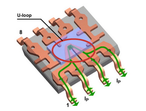 對于高達(dá) ±20 A 的小標(biāo)稱電流,霍爾芯片和主電流路徑采用標(biāo)準(zhǔn)尺寸 SOIC8 表面貼裝封裝,如圖 1 和圖 3 所示。這提供了一種緊湊、薄型的解決方案,可兼容具有大批量自動化電路板組裝技術(shù)。倒裝芯片技術(shù)的使用可以優(yōu)化霍爾元件的有源面與被感測電流產(chǎn)生的磁場之間的磁耦合。因此不需要通量集中器。用于電流檢測的銅路徑的內(nèi)阻通常為 1.5 mΩ,以實(shí)現(xiàn)低功耗。電源端子也與低壓信號 I/O 引腳電氣隔離。精心的 IC 和封裝設(shè)計(jì)可以進(jìn)一步改善器件的電壓隔離,