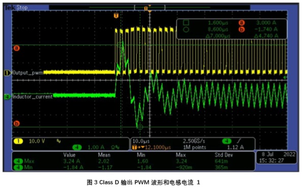 在上圖中綠色波形為流過(guò)電感電流,黃色波形為音頻功放輸出 PWM 波形。
