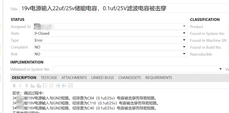進一步排查發(fā)現(xiàn)均是MLCC電容失效,對失效MLCC進行測量發(fā)現(xiàn)均為短路失效模式。板卡供電是19V供電,而選取的電容均為25V耐壓,在插拔設(shè)備適配器時,19V電壓會產(chǎn)生2-3V的毛刺。已經(jīng)接近所使用電容的耐壓極限參數(shù)。因此比較容易損壞。