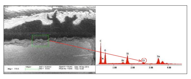 鹵化物是離子性的并且?guī)в须姾桑焕,Cl‐、Br‐ 和 F‐。氯是電負性強的離子,該物質(zhì)通過 Vcc(電源)電勢引起的電場漂移遷移到封裝中。Vcc(電源)焊盤通常是個受到氯相關(guān)問題“攻擊”的焊盤。一般來說,GND(地)焊盤一般不會被腐蝕,因為該焊盤一般處于地電位或電位。Vcc(電源)焊盤通常是個受到氯相關(guān)問題“攻擊”的焊盤。一般來說,GND(地)焊盤一般不會被腐蝕,因為該焊盤一般處于地電位或電位。這表明不需要對鉛模具界面進行分層以使離子污染物進入。僅僅存在離子物質(zhì),在存在水分和電位差等加速因素的情況下,足以啟動離子污染過程。圖 1 顯示了環(huán)境中的氯離子如何進入封裝并腐蝕焊盤的機制。圖 2 顯示在引線框架與模制化合物(未分層)之間的界面處發(fā)現(xiàn)了氯,圖圖3顯示了由于使用鹵化物助焊劑而導(dǎo)致的焊盤腐蝕。