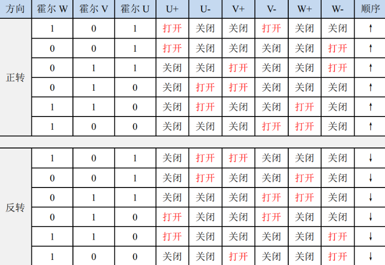 V+U- W+U- W+V- U+V- U+W- V+W- (有一個特點:按照UVW這個順序變化的是正轉(zhuǎn))W+ W+ U+ U+ V+ V+,負也是這樣的。