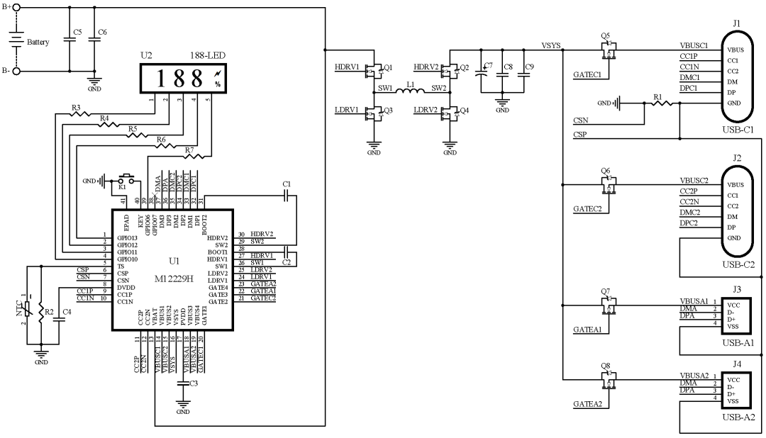 M12229H是一款面向2串電芯 35W移動(dòng)電源應(yīng)用的專(zhuān)用 SOC,集成了同步升降壓電壓變換器、電池充放 電管理模塊、顯示模塊、電量計(jì)算模塊,提供35W 輸入/輸出功率,支持PD3.0、QC3.0、AFC、FCP、SCP、 BC1.2 DCP 等主流快充協(xié)議,并提供輸入/輸出的過(guò)壓/欠壓、電池過(guò)壓、過(guò)充/過(guò)放、NTC 過(guò)溫、放電過(guò)流、輸出短路保護(hù)等完備的保護(hù)功能。配合極簡(jiǎn)的外圍電路,即可組成35W多口移動(dòng)電源。 |