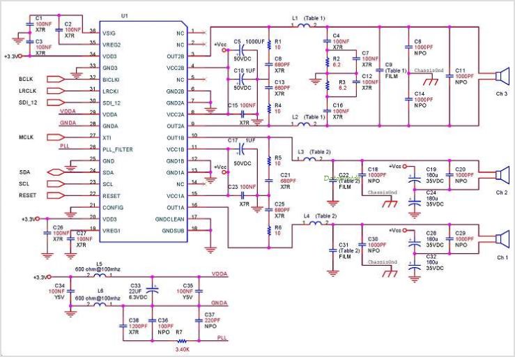 具有防破音功能的免電感濾波2×20W D類立體聲音頻功放 |