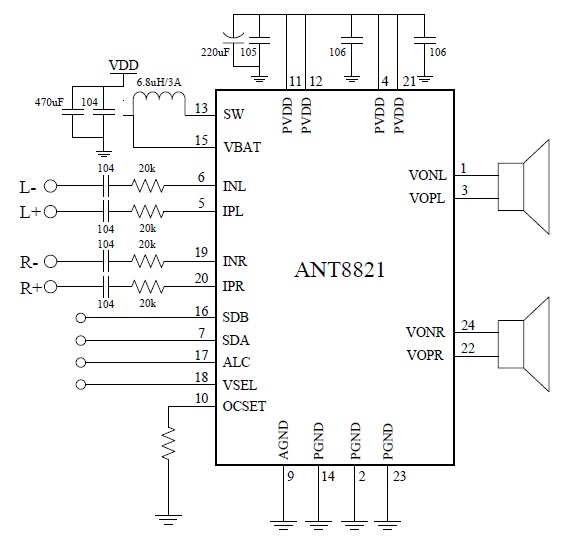 產(chǎn)品名稱: ANT8821(自適應(yīng)升壓、超低EMI、G類4.5W雙聲道音頻功放IC)